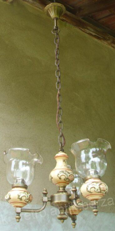 Predivni, stari luster, majolika, staklo i metal. Visina: 90cm. (može se smanjiti), širina između stakla: 37cm., težina: 2.6kg. Za tri male sijalice. Bez oštećenja. Ispravan.