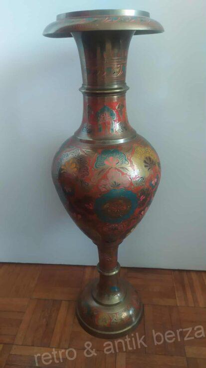 Velika mesingana indijska vazna, ručno rezbaren lep cvetni motiv. Iz 70-ih godina XX veka. Visina 60cm, širina najdebljeg dela 20cm, prečnik otvora 13,5cm. Teška 3,6kg.