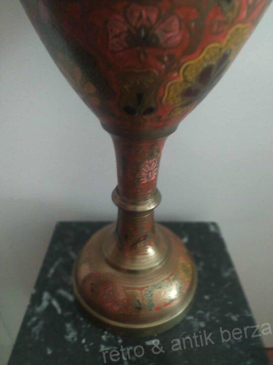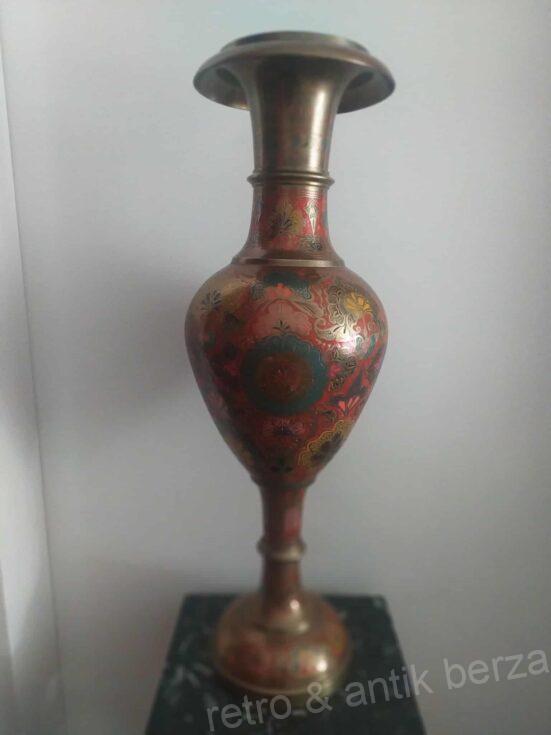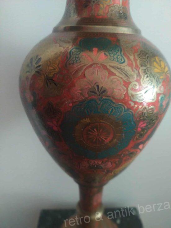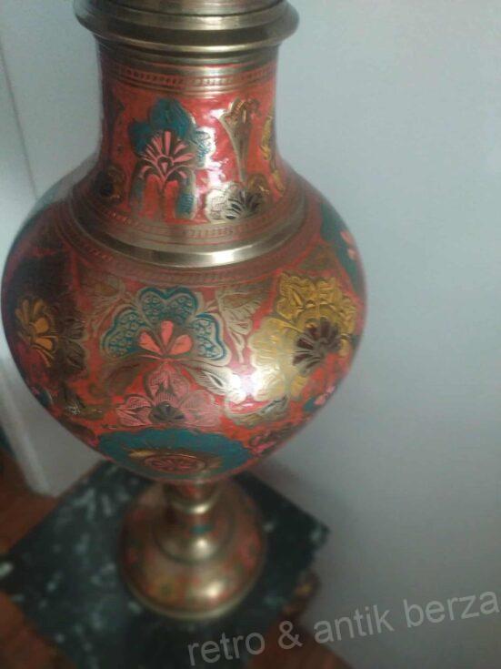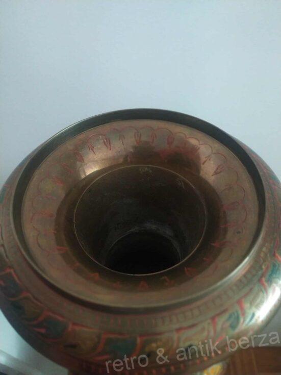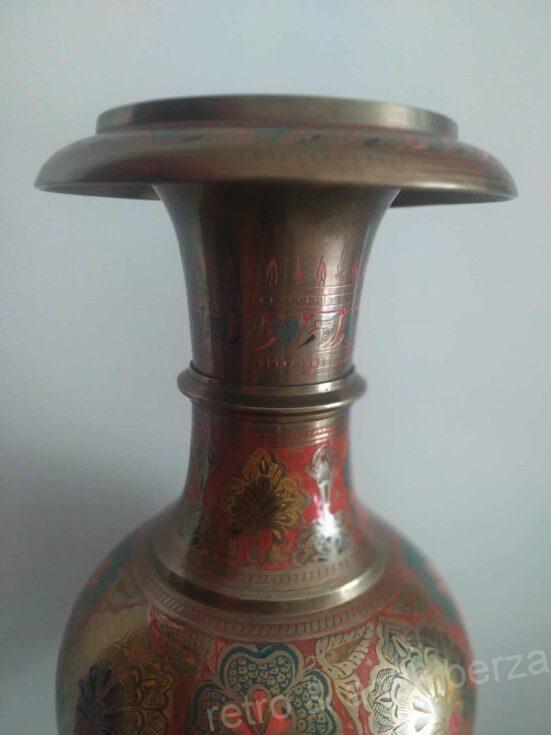 Velika mesingana indijska vazna, ručno rezbaren lep cvetni motiv. Iz 70-ih godina XX veka. Visina 60cm, širina najdebljeg dela 20cm, prečnik otvora 13,5cm. Teška 3,6kg.