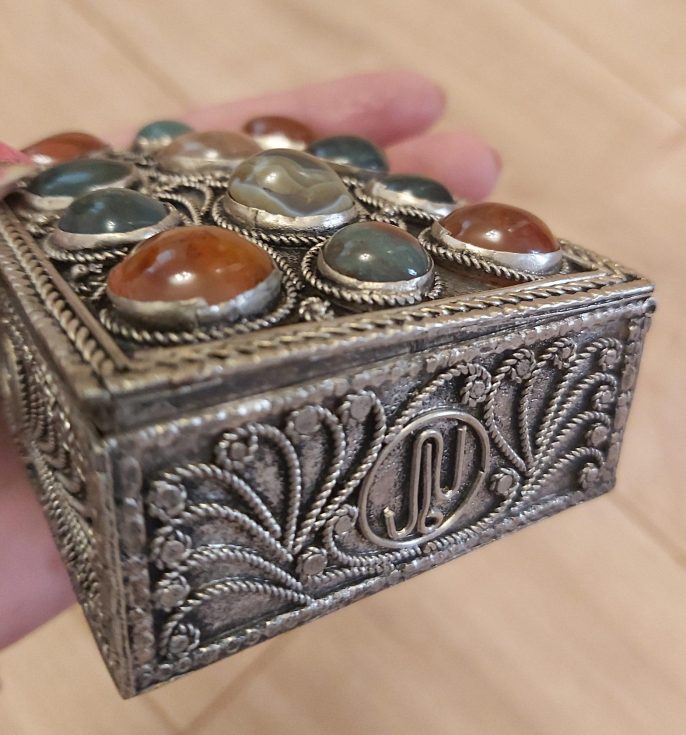 Filigran kutija za nakit, srebro sa poludragim kamenjem.