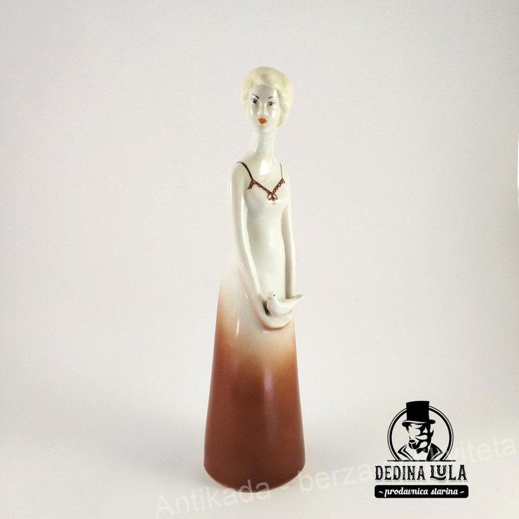 Ljupka dama sa golubicom. Porculanska figurina predstavlja lik mlade dame iz 20-ih godina XX veka koja u rukama drži golubicu. Figura je visoka i vitka i uzima pažnju gde god da je stavite. Zanimljiv simplistički dizajn, u odličnom stanju. Pogledajte slike.
