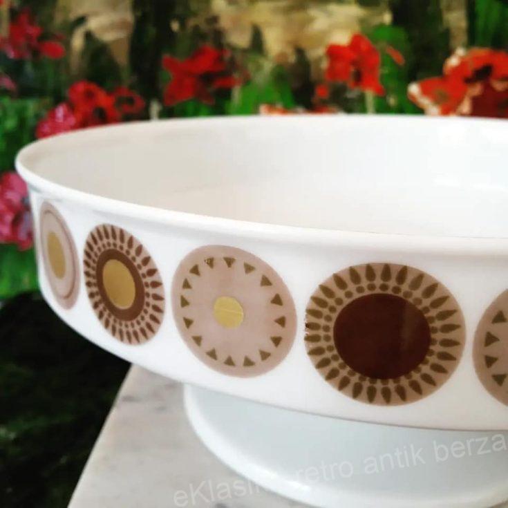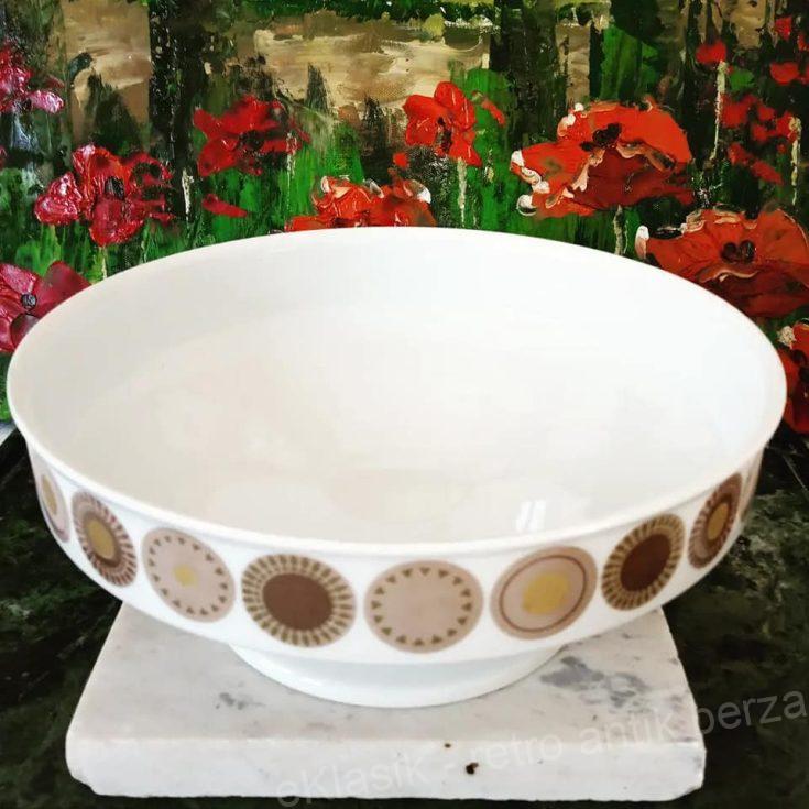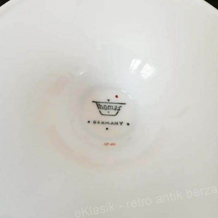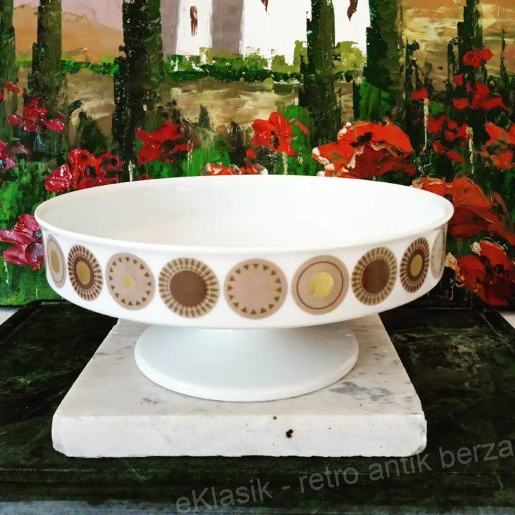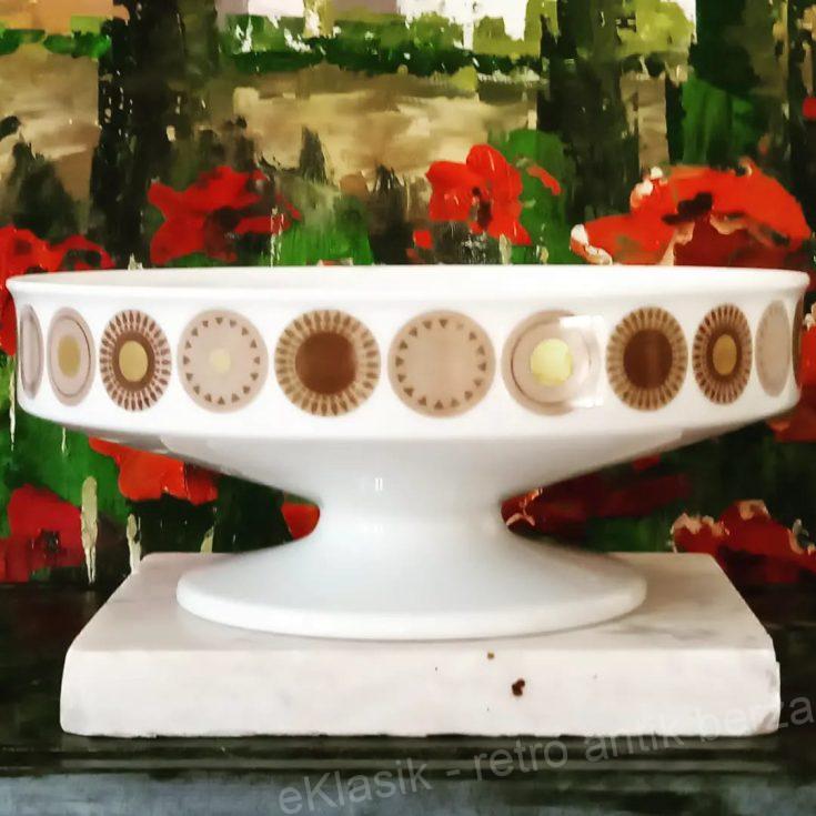 Frutijera porcelanska, Tomas porcelan, deo Rozental grupe. Frutijera je 8,5 cm visine, prečnika na vrhu 20,5 cm. Snežno beli porcelan dekorisan je celim krugom spoljnog dela oboda medaljonima koji podsećaju na stilizovano sunce. Cena: 5000 dinara, kontakt: 0607065754