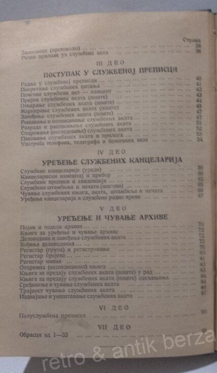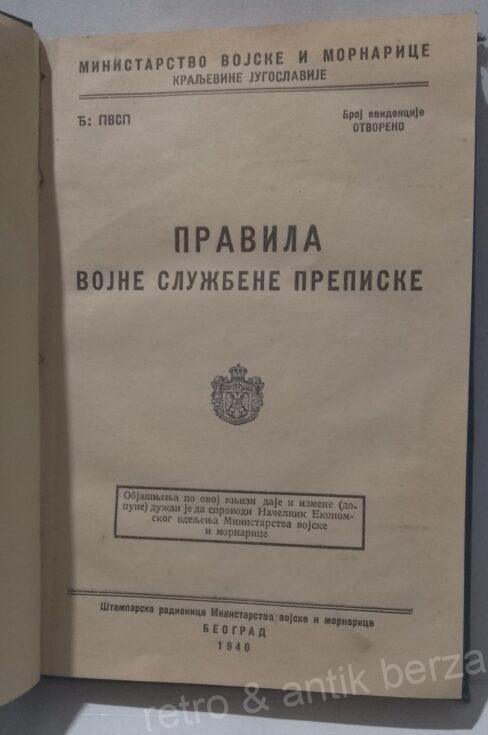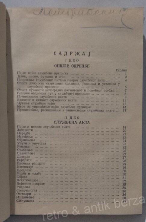 Izdanje Ministarstva vojske i mornarice kraljevine Jugoslavije, Đeneralštab KJ, 1940. Tvrd platneni povez, format A5, 150 strana, tekstualni deo na prvih 90 strana, ostalo primeri službenih obrazaca; naredbe, dozvole, saslušanja, otpusti … Korice imaju nekoliko fleka, nekoliko listova u sredini, prelomljeno na uglovima donje margine, u visini 1 cm, ostalo perfektno.