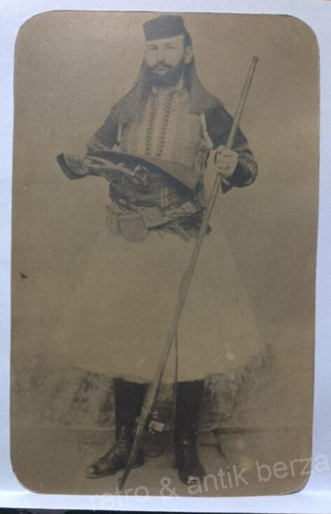 Fotografija “kartonka”, ratnik u tradicionalnoj nošnji u kojoj dominira kratka, naborana košulja fustanela, oko koje se, među balkanskim etnolozima, vode ozbiljne rasprave, a posebno je svojataju Grci i Albanci. Prema nekim izvorima, tipološki, u cilju determinacije, grčka fustanela ima oko 100 nabora, a albanska oko 60. Nije nepoznata ni u Bosni, Crnoj Gori, Bugarskoj, vojvoda Iljo Mitrov Maleševski, i njegovi četnici, ovekovečeni su na fotografijama baš u fustaneli. Nosili su je i turski bašibozuci, te je teško i nezahvalno odrediti etničku pripadnost ratnika sa fotografije. Prema oružju, puška “tančica” ili “karanfilka” i kubure ” šilje “, upućuju na sever Albanije, mada, u ovom periodu, oružje i odeća mogu da imaju više geografski nego etnički karakter, što zbog izmešanih etničkih grupa, otvara mnoga pitanja. Fotografija je u odličnom stanju, 16,5 x 10 cm, natpis na poleđini nečitak.