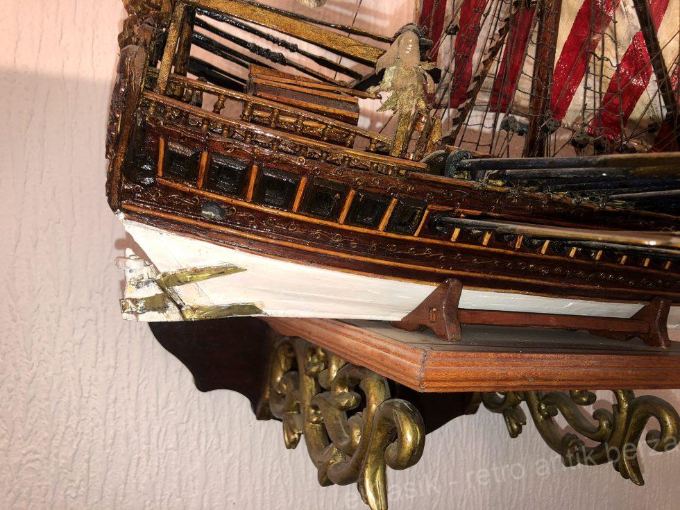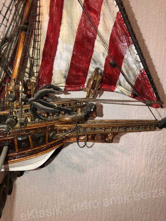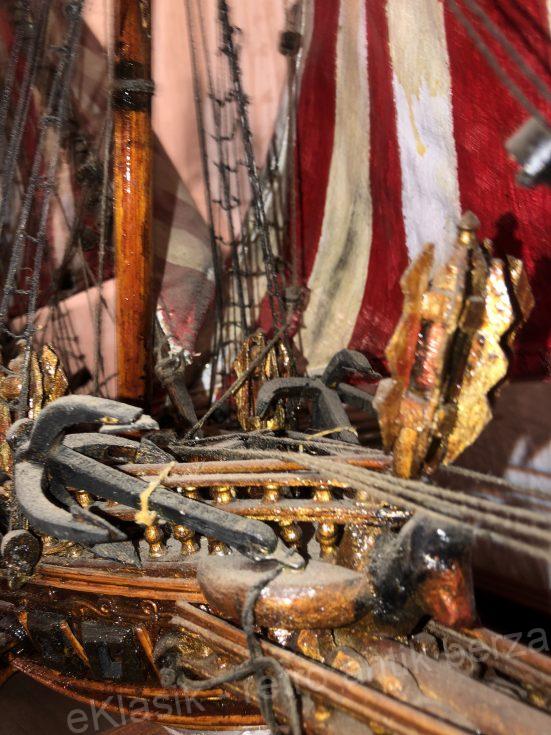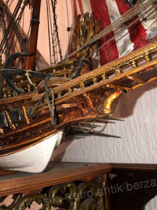 Veliki drveni model brod , U POTPUNOSTI JE NAPRAVLJEN RUČNO , po ORIGINALNOM NACRTU ( BLUE PRINT) BEZ KUPOVNIH DELOVA, , rađen kao pravi brod . Ne kobilici stavljena rebra , na rebra stavljene letvice , na letvice stavljeni slojevi mahagoni turnira . Koristeno 2-3 vrste drveta . Jedra ručno šivena farbana oblikovana i lakirana .