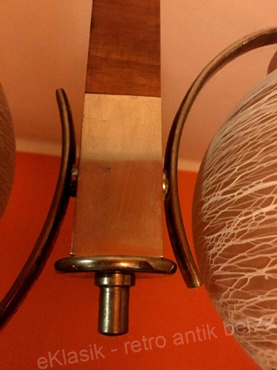 Donji delo šipke lustera sadrži izduženi element od drveta, kvadratnog preseka, koji na dnu ima širi metalni prsten iz kojeg izranjaju dva kraka u vidu zaobljnih metalnih traka koje nose staklene širme / abažure. Kraci se mogu podesiti tako da kada se posmatraju zajedno imaju oblik slova „S“ ili se mogu okrenuti simetrično tako da svaki krak drži širme odozdo ili odozgo. Unutar ovih nedovršenih kružnica nalaze se dve okrugle staklene širme sa predivnom reljefnom mrežastom teksturom. Staklo je bledo roze boje a mrežasta tesktura je bela, tako da odaje prelepo i ujednačeno svetlo po celoj prostoriji.