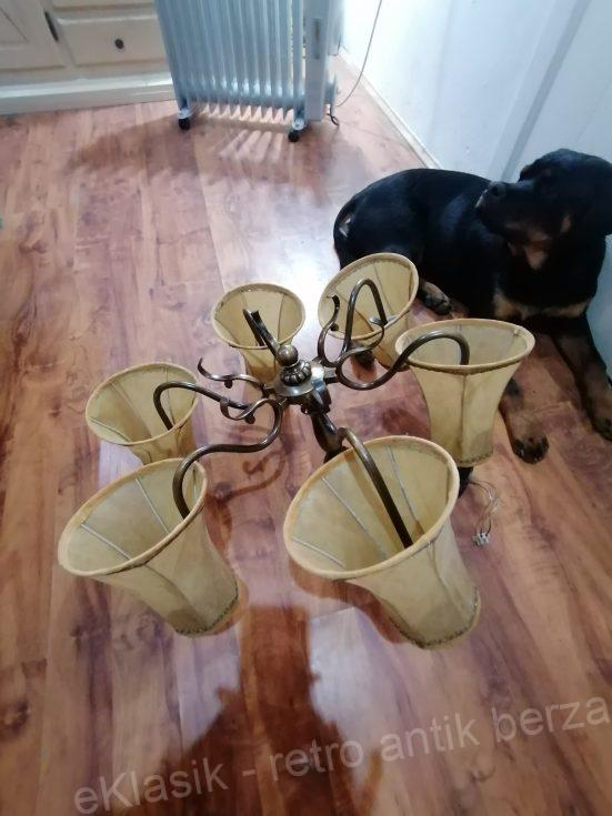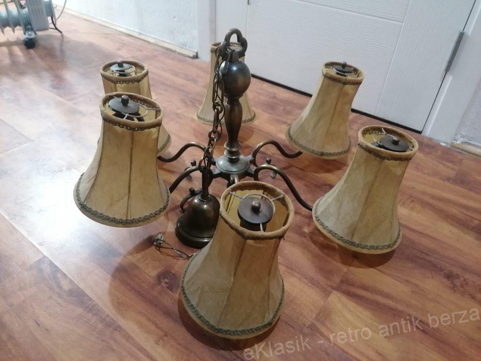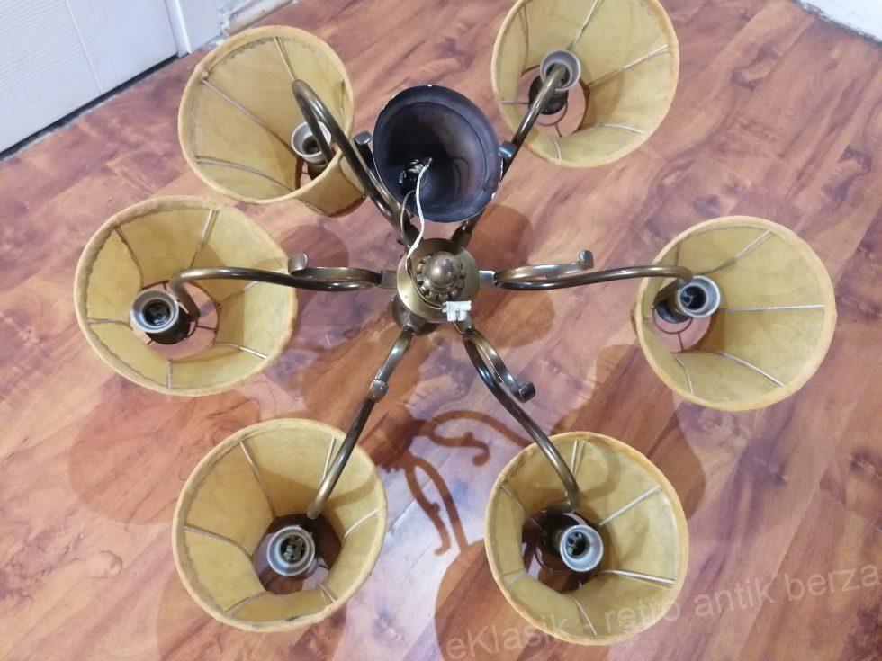 Stari mesingani luster je u odlicnom stanju. Ceo luster je od mesinga. Ima 6 grla i stare keramicke fasunge.