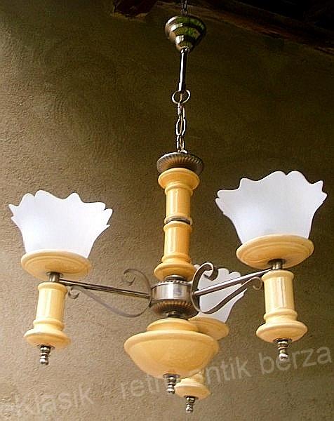 Stari luster, keramika, staklo i metal. Idealan za holove, kancelarije i sve veće prostorije. Visina: 75cm., širina između stakla: 53cm., težina 4.2kg. Za tri male sijalice. Bez oštećenja. Ispravan.