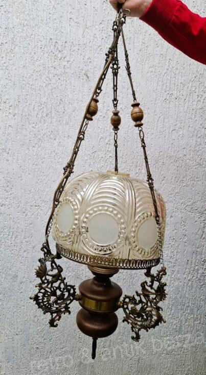 Kolekcionarski primerak u stilu lustera sa tri kraka, koji se često naziva i francuski luster, star oko 100 godina. Napravljen od bronzane ili mesingane strukture sa ukrasnim elementima, drvenih detalja i staklenog abažura. Luster nema oštećenja.