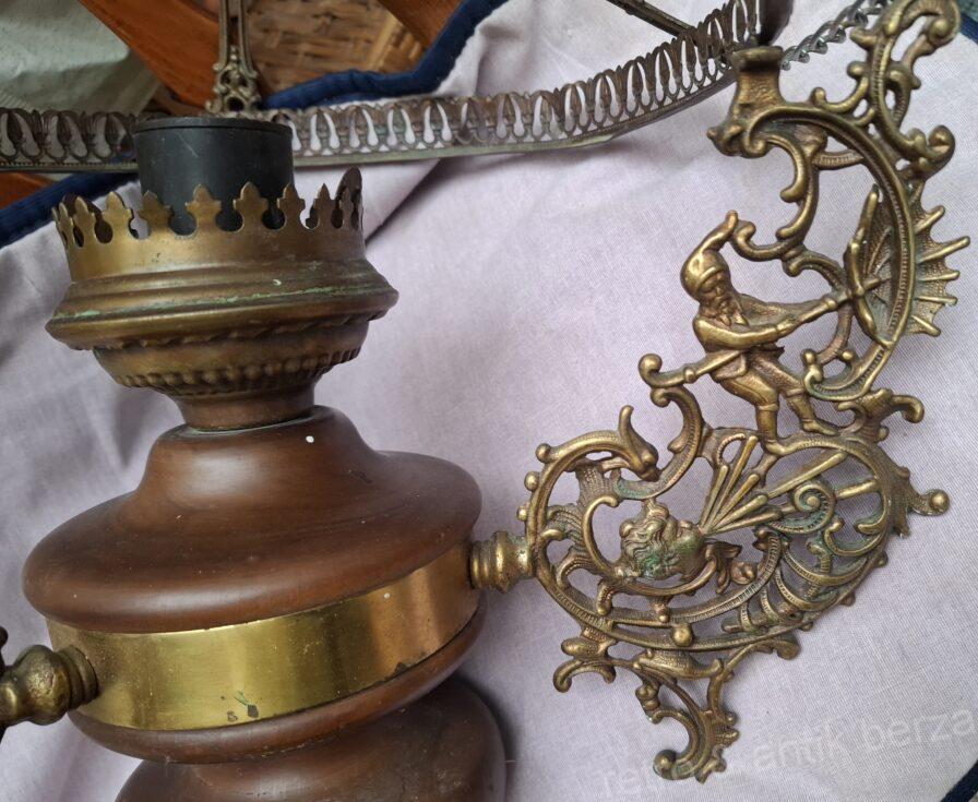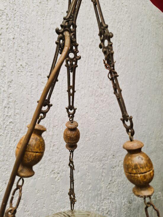 Kolekcionarski primerak u stilu lustera sa tri kraka, koji se često naziva i francuski luster, star oko 100 godina. Napravljen od bronzane ili mesingane strukture sa ukrasnim elementima, drvenih detalja i staklenog abažura. Luster nema oštećenja.