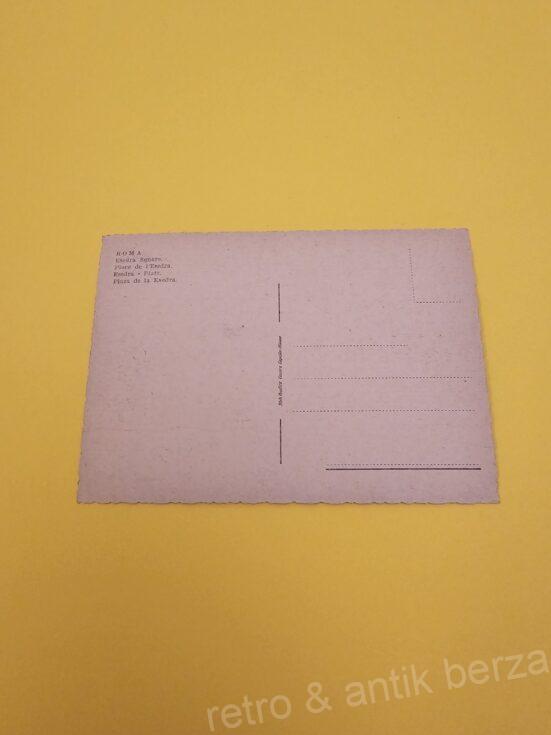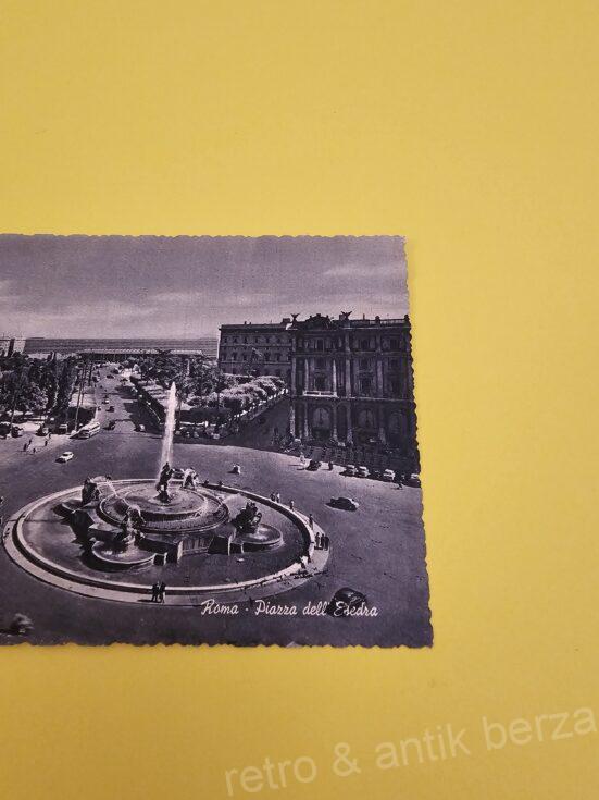 Na razglednici se vidi trg Esedra sa fontanom u Rimu iz pedesetih godina prošlog veka.