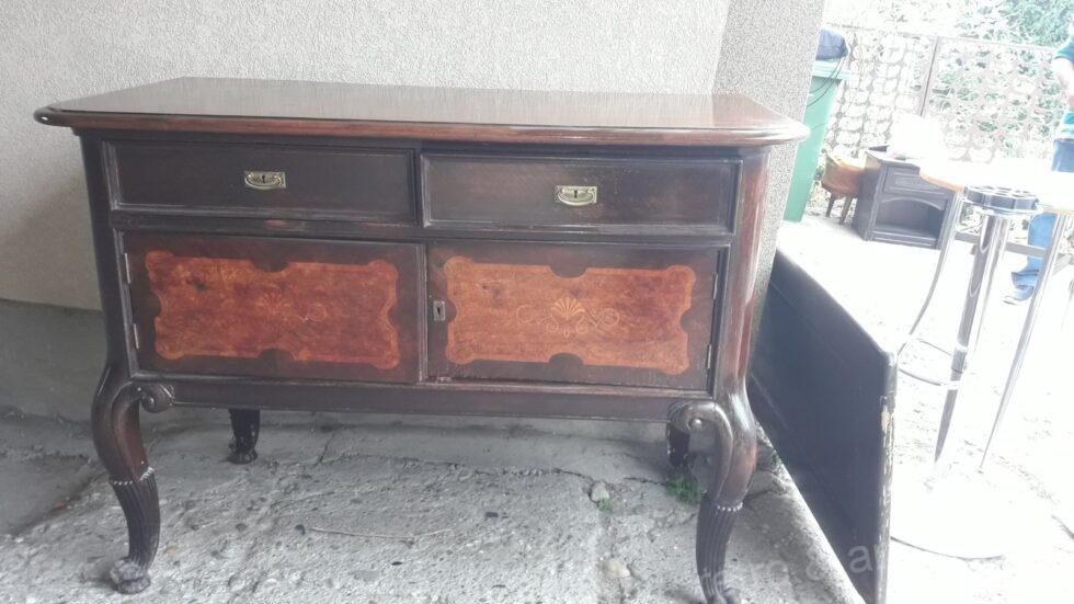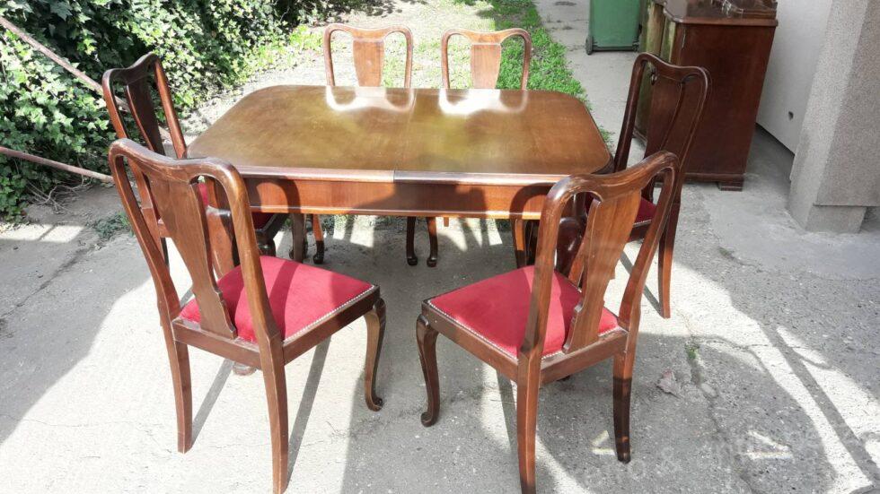 Trpezarija puno drvo, sto sa sest stolica, cetvorokrilni server, dvokrilni server, komoda intarzija. staklena vitrina i dva bracna kreveta sa ormaricima..