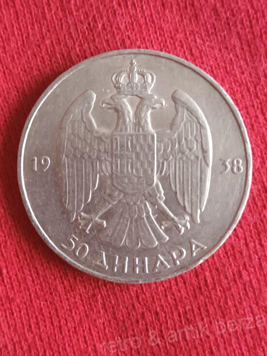 srebrni novčić od 50 dinara iz Kraljevine Jugoslavije iz 1938. godine, sa prikazom grba sa krunisanim orlom