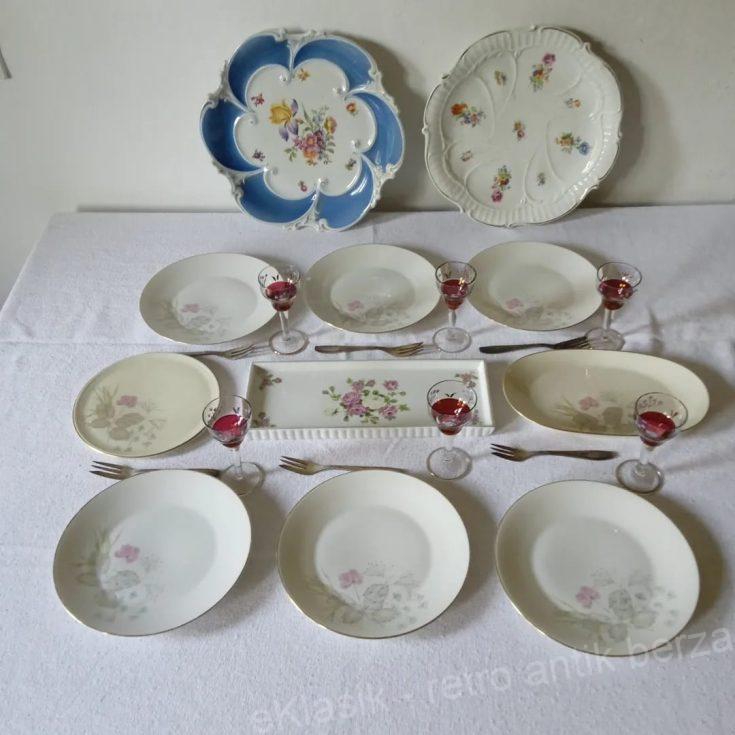 Rozental (Rosenthal) porcelan, šest tanjira za kolače, druga polovina XX veka, Nemačka. Prečnika su 19,5 cm, dekorisani sa nekoliko stilizovanh cvetova. Postavio sam ih sa nekoliko dodatnih predmeta; na poslednjoj fotografiji, nalaze se jedna okrugla tacnica a sa druge strane jedna duguljasta, između kojih je centralna tacna. Proizvođač i cvetni dezen su identični, ne i nijansa osnove porcelana. Verovatno su obe služile za escajg i salvete, i dajem mogućnost kupovine obeju. Cena šest tanjira je: 4500 dinara (sve na fotografijama takođe se nalazi u prodaji kao jedinačni oglasi)