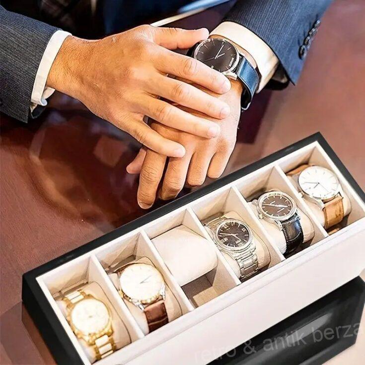 Crna tapacirana kvalitetna providna kutija organizator za 6 satova ili nakit.