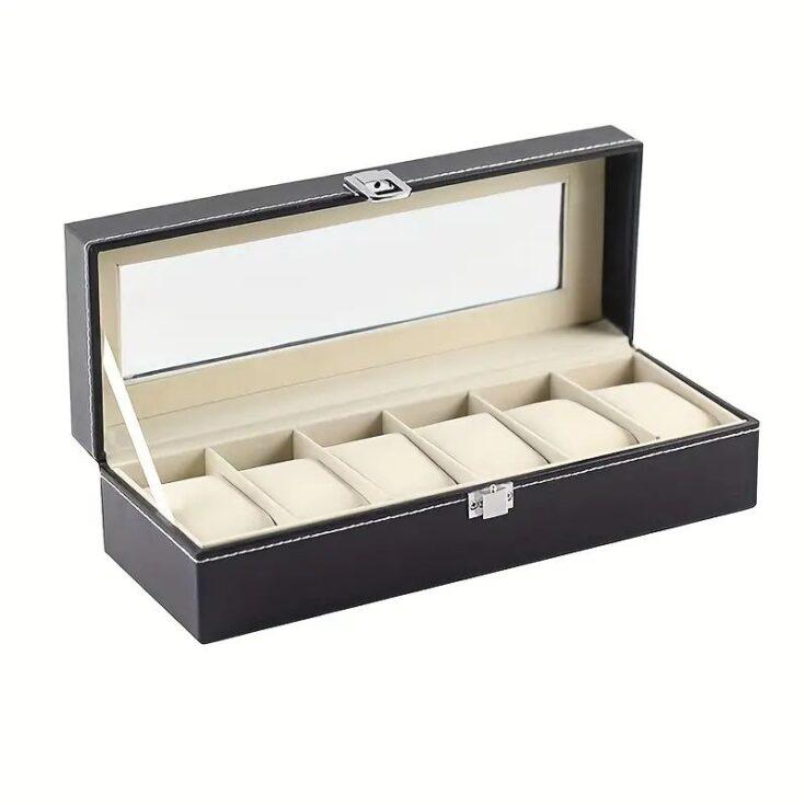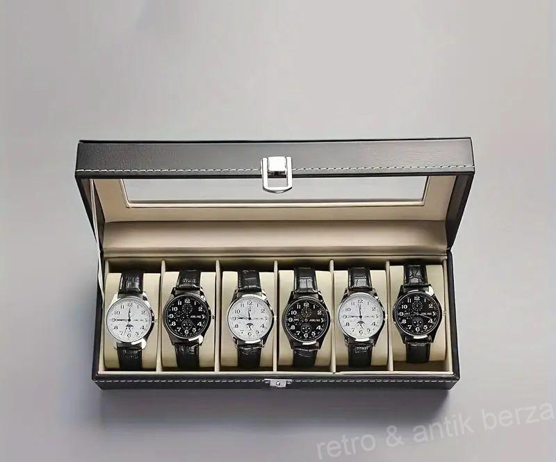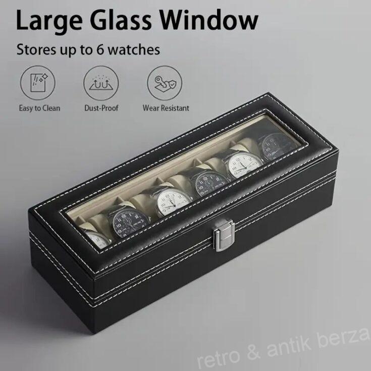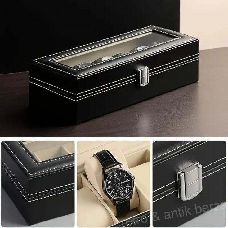 Crna tapacirana kvalitetna providna kutija organizator za 6 satova ili nakit.