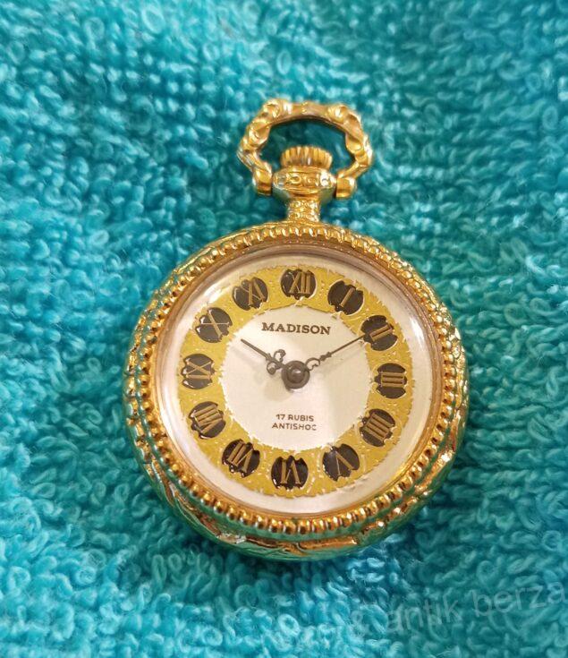 Ženski pozlaćeni čuveni Madison mehanički (na navijanje) sat-privezak za ogrlicu sa ornamentima cveća sa zadnje strane i rimskim brojevima. 17 rubina.