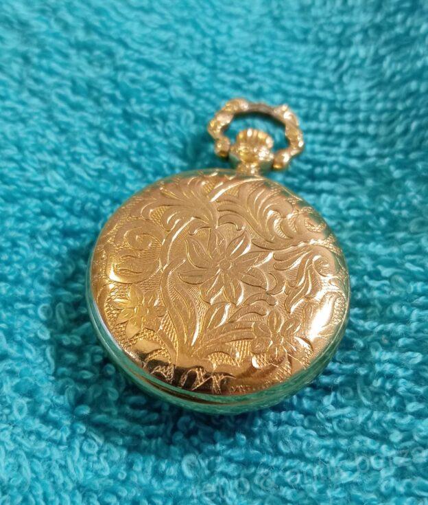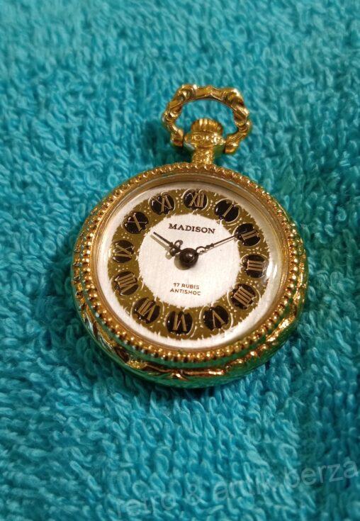 Ženski pozlaćeni čuveni Madison mehanički (na navijanje) sat-privezak za ogrlicu sa ornamentima cveća sa zadnje strane i rimskim brojevima. 17 rubina.