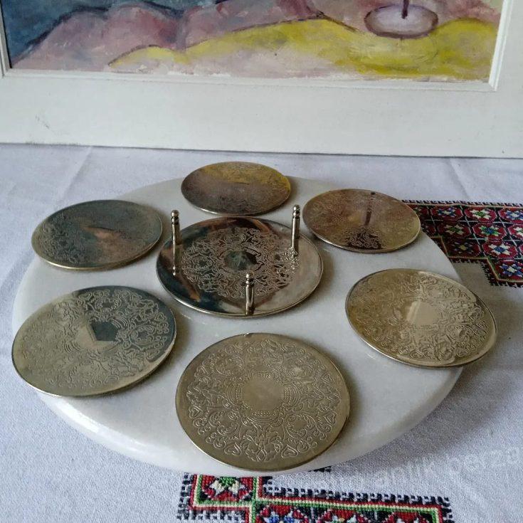 Šest podmetača za čaše sa kućištem, od niklovanog metala sa gumenim dnom. Prečnika su 9 cm, prečnik postolja je 12 cm. Podmetači su dekorisani utisnutim u metal dekorativnim reljefima. Cena: 2000 dinara, kontakt: 0607065754