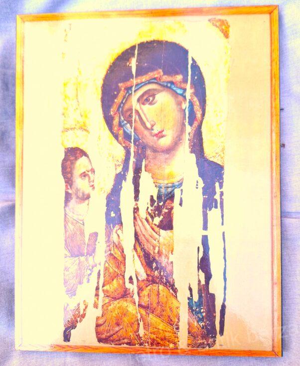Replika vizantijske ikone Bogorodice, poznatu kao Teotokos (Bogorodica). Ova slika prikazuje čuvenu pravoslavnu ikonu Bogorodice Odigitrije (u prevodu “Putevoditeljka”) iz manastira Hilandar na Svetoj Gori. Reč je o najstarijoj hilandarskoj ikoni, mozaiku koji datira iz perioda oko 1200. godine. Smatra se remek-delom evropskog slikarstva XIII veka.