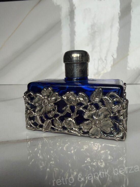 Prelepa kolekcionarska parfemska bočica iz 1970-ih, izrađena od duboko kobaltno plavog stakla, sa masivnim livenim metalnim ukrasom u floralnom motivu.