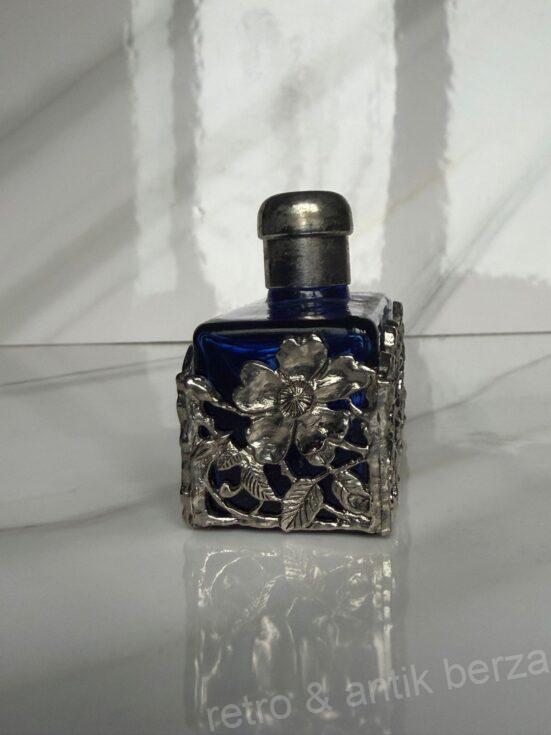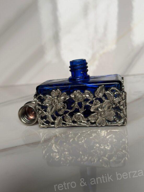 Vintage kobaltno plava parfemska bočica sa metalnim floralnim dekorom – 1970-te