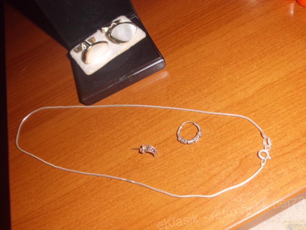 Srebrna sajlica, nastavljana, manžetne sa sedefom dve naušnice, kaučuk srebro narukvica bez kopče.