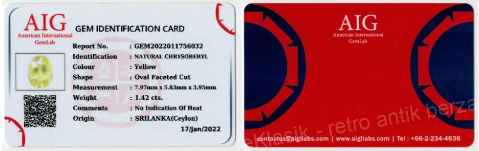 .Уз драги камен добијате и кратки извештај ,Америцан Интернатионал ГемЛаб (АИГ)