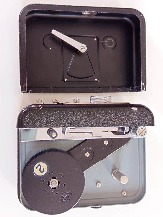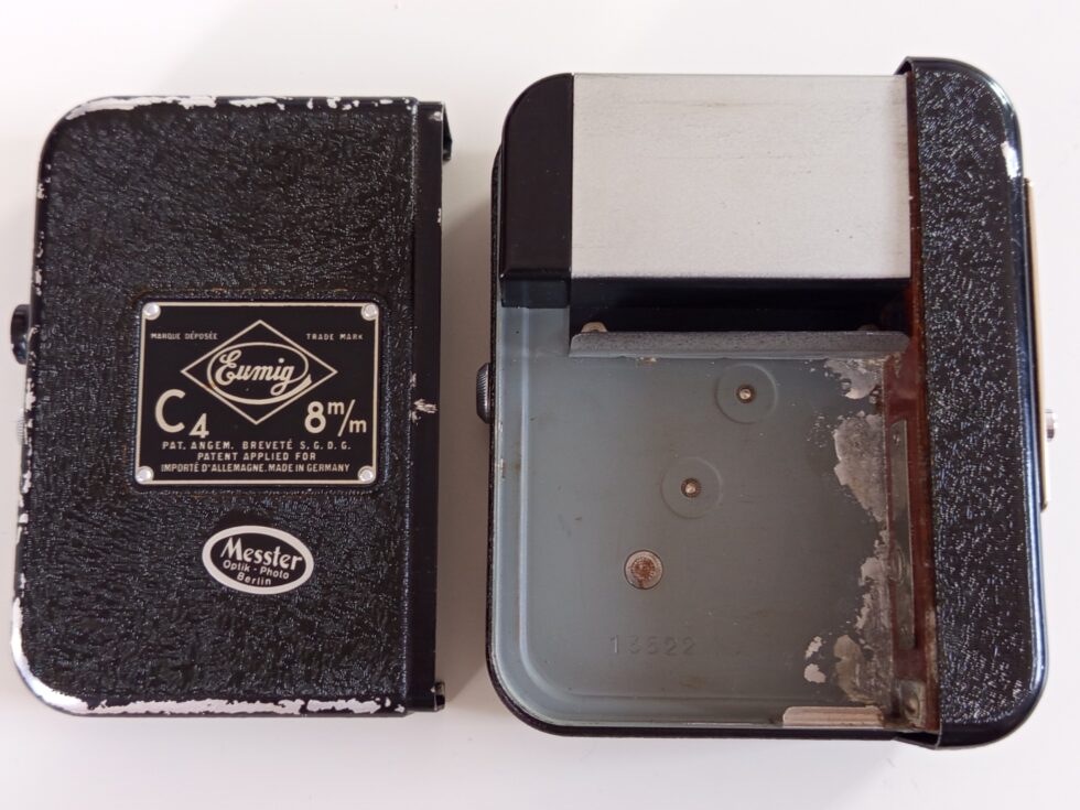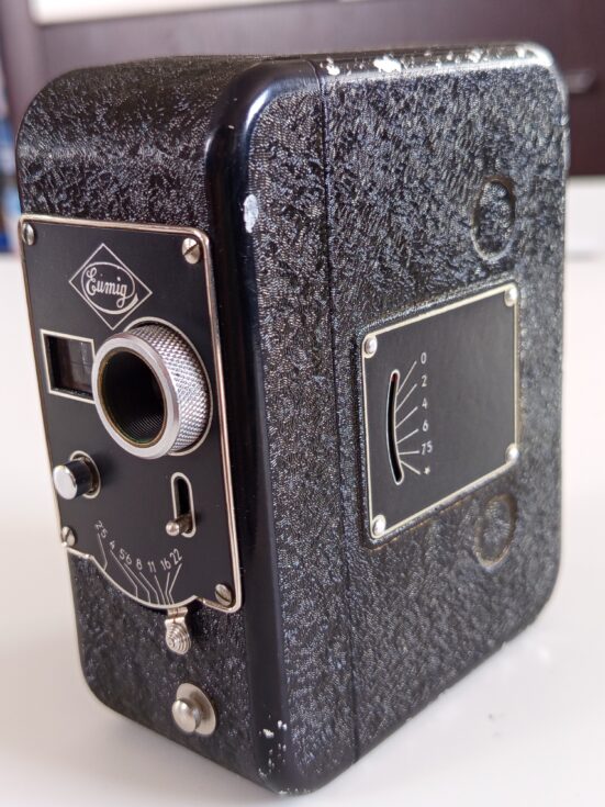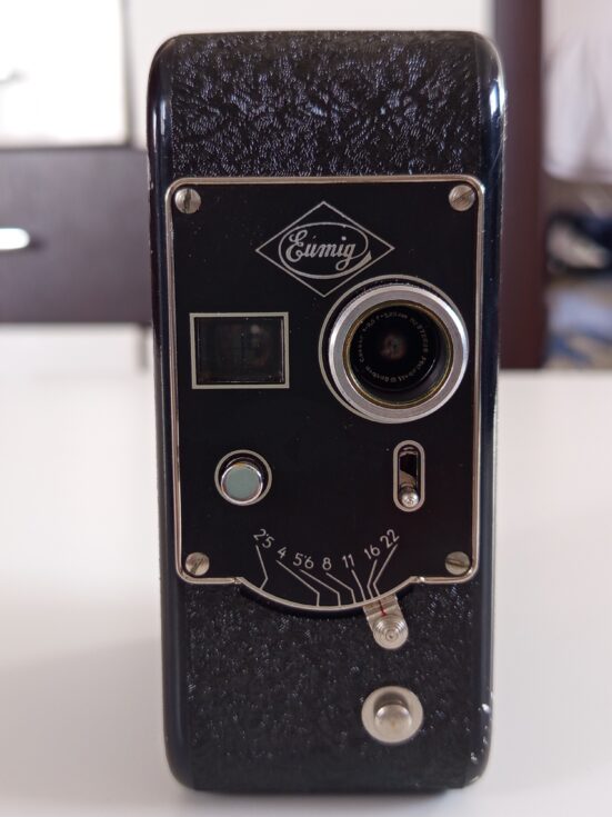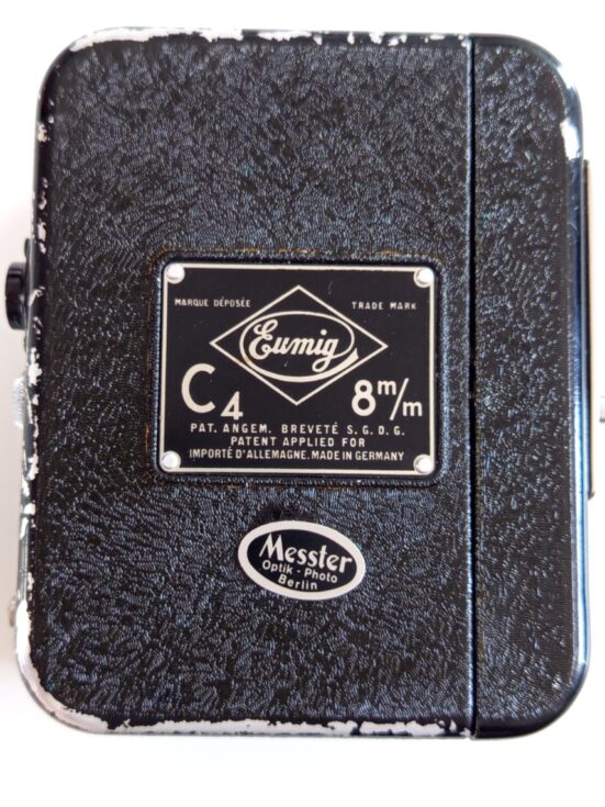 Kamera Eumig C4 8mm iz 1938 godine u koznoj futroli. Koristi bateriju od 4.5V koju nemam pa ne mogu da proverim ispravnost. Lep kolekcionarski primerak.