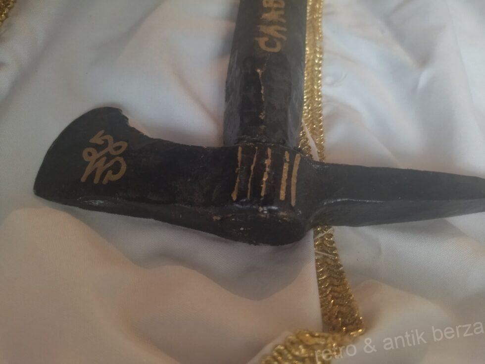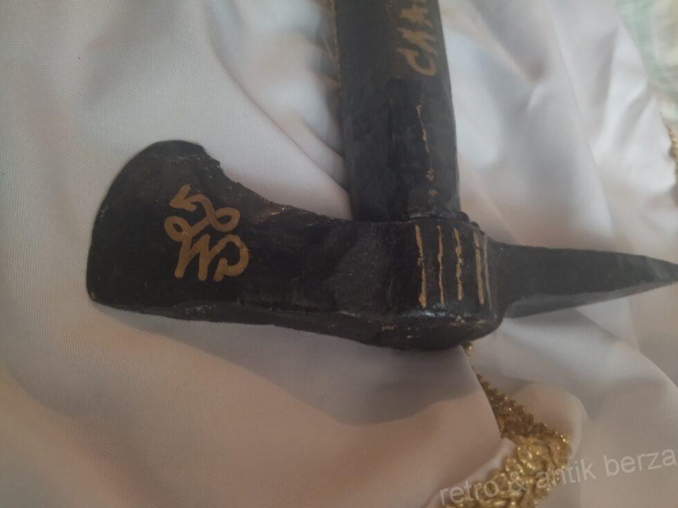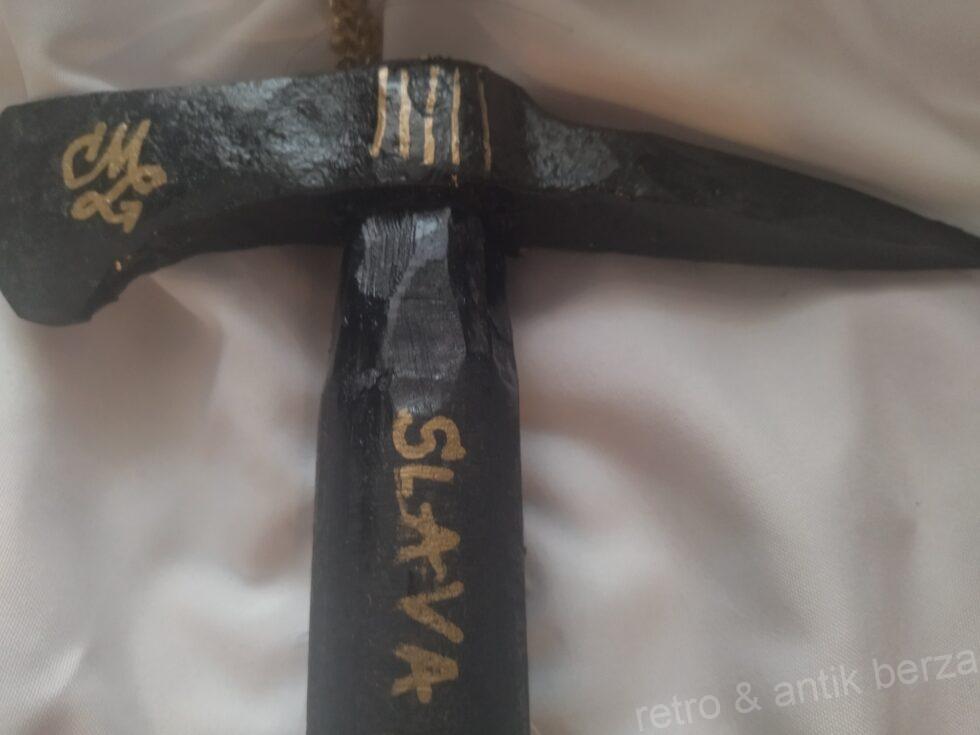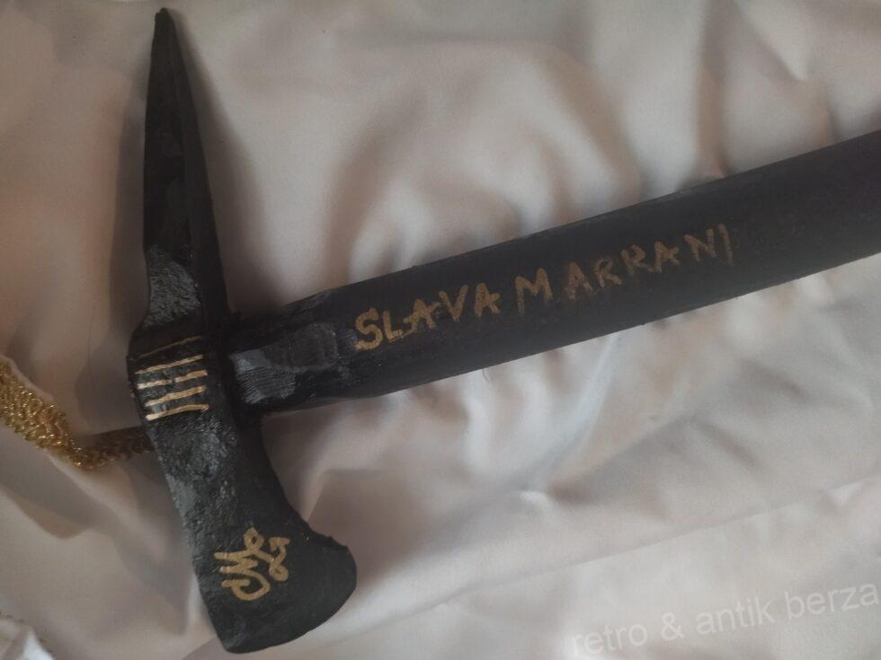 Sekira crne boje, sa duplim potpisom Слава Маркани i Slava Marlani , tomahawk sa šiljkom ručki rad slikara Slave Marakanija 5600$.